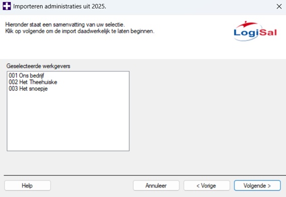 - Geaccepteerd administraties. Dit veld bevat de administraties die door LogiSal geïmporteerd zullen worden. Klik op “Volgende”.