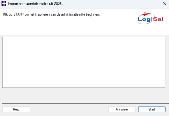 Controleer hier of de juiste map geselecteerd is. Dit is namelijk de map waarin LogiSal gaat zoeken naar de administraties die je wilt importeren. De bovenstaande afbeelding is gemaakt in LogiSal2026; het is dus correct dat LogiSal gaat zoeken in de map LogiSal2025 omdat deze map de administraties van het voorgaande jaar bevat: 2025.