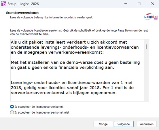 Selecteer “Ik accepteer de licentieovereenkomst” om door te gaan met de installatie. Klik op “Volgende”.