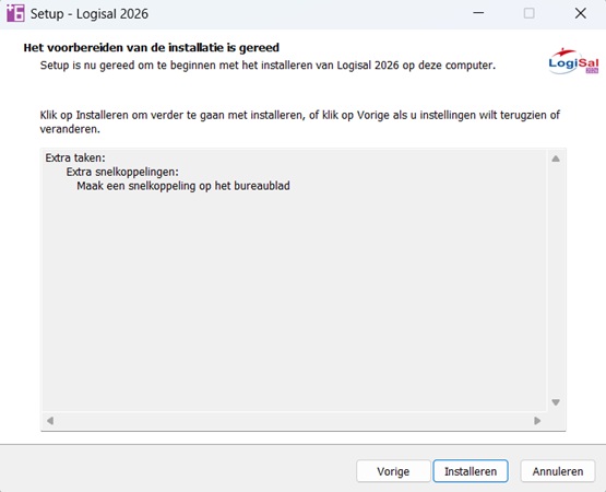 Door het vakje voor “Maak een snelkoppeling op het bureaublad” aan te klikken geef je LogiSal toestemming om een snelkoppeling op je bureaublad aan te maken.