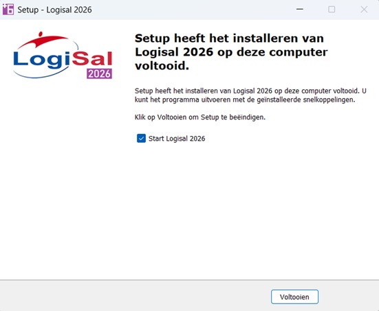 De installatie is voltooid. Als je op “Voltooien” klikt dan wordt het installatieprogramma afgesloten en wordt LogiSal geopend. Wil je niet dat LogiSal gelijk opent? Klik dan op het vakje voor “Start LogiSal 2026” om deze optie uit te schakelen.