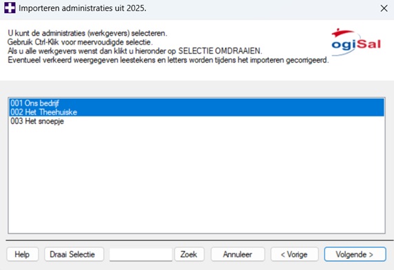 Als je meerdere administraties wilt importeren, houd dan de toets Ctrl ingedrukt en klik op de namen van de administraties. Als ze blauw kleuren dan zijn ze geselecteerd. Als je de gewenste administraties hebt geselecteerd, klik dan op “Volgende”.