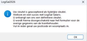 Als je de onderstaande melding krijgt bij het invoeren van de licentiesleutel betekent dit dat je waarschijnlijk LogiSal2025 hebt besteld en LogiSal2026 herkent deze sleutel niet.
